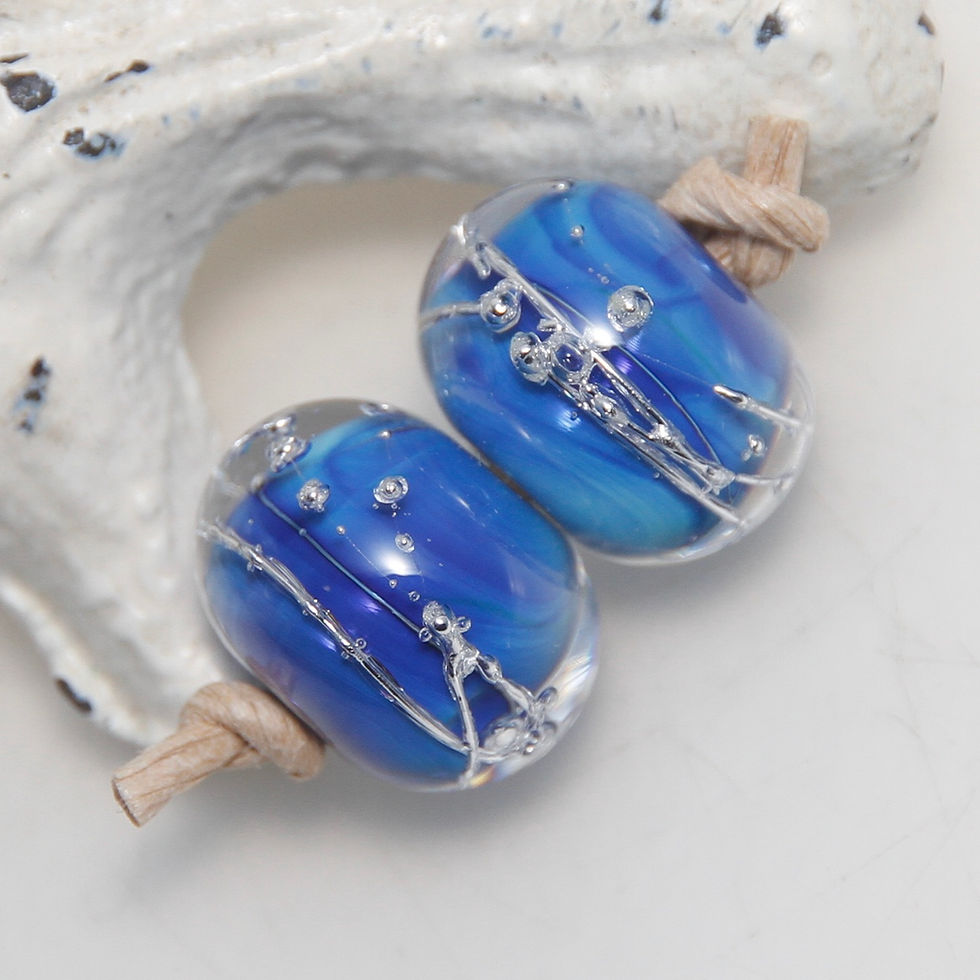 Soft Blue Silver Bubbles Lampwork Glass Bead Pair