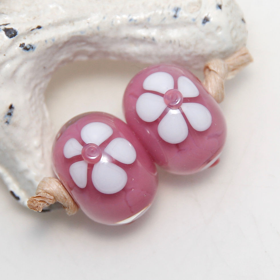Pink with White Daisy Flowers Lampwork Glass Bead Pair