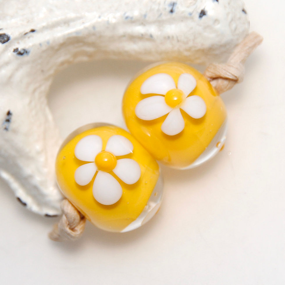 Sunny Yellow with White Daisy Lampwork Glass Bead Pair
