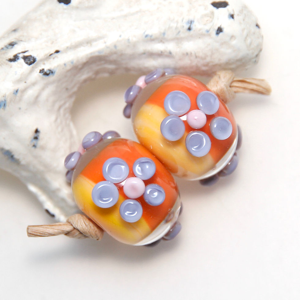 Orange and Yellow with Dot Flowers Lampwork Glass Bead Pair